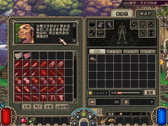 左边是NPC贩卖的商品列表和功能按钮,右边是玩家的物品栏。购买和贩售可以通过物品的在左右栏的拖拽实现!